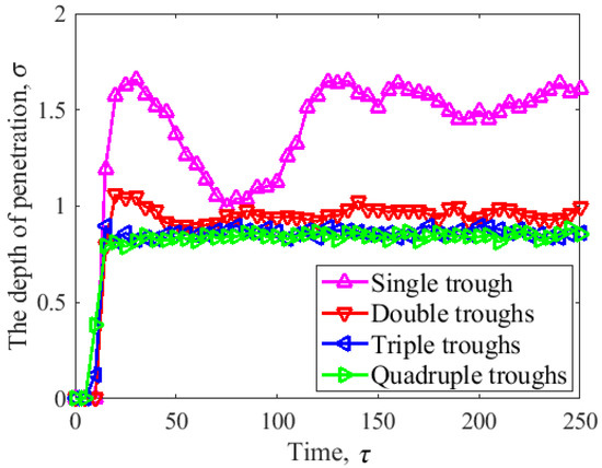 Figure 7 illustrates the changes in penetration depth when four types of sliders came into contact with the disk. When the number of cylindrical asperities was , the penetration depth increased instantaneously with the penetration time when the slider came into contact with the disk. At this time, the penetration depth exceeded , and then the change trend fluctuated greatly. When the number of cylindrical asperities was , the variation trend of the penetration depth of the slider when the slider came into contact with the disk was roughly the same. The penetration depth increased instantaneously with the penetration time and then gradually tended to be constant. During the change processes of contact depth shown in the figure, a noteworthy observation was that the increase in the number of cylindrical asperities increased the contact area of the head and disk, resulting in a decrease in the penetration depth of the slider. When the surface of the slider had multiple asperities, the contact depth between the head and disk decreased accordingly. Moreover, the penetration depth remained unchanged if the number of asperities was larger than three.