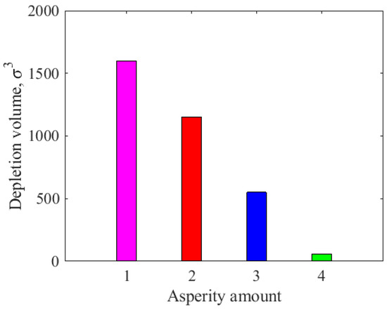 Figure 8 displays the influence of the number of different cylindrical asperities on the lubricant depletion volume. When the number of cylindrical asperities was , the lubricant consumption resulting from the contact between the slider and the disk exceeded . When the number of cylindrical asperities was , the lubricant depletion volume was between and . When the number of cylindrical asperities was , the depletion volume of lubricant was between and . When the number of cylindrical asperities was , the depletion volume of the lubricant was less than , which is negligible compared with the other three. In short, as the number of asperities on the slider increased, it became evident that the surface contact area of the head–disk increased, and the depletion volume of the lubricant in the contact state gradually decreased. Although Figure 7 shows that the penetration depth was almost the same for three asperities and four asperities, the depletion volume of the lubricant for four asperities was much lower than that for three asperities. This is because there was no more space to store the transferred lubricant for the slider with four asperities (Figure 6d). Therefore, increasing the number of slider asperities is beneficial in terms of reducing friction loss.