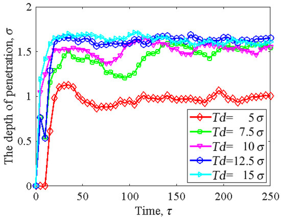 Figure 9 displays the influence of the different cylindrical asperity depths on the penetration depth of the slider. Without changing the width of the slider asperity, when the cylindrical asperity depth was , the penetration depth of the slider was the lowest. It increased instantaneously with time and then gradually tended to be stable. When the cylindrical asperity depth was , the contact depth of the head–disk increased with the increase in the asperity depth, but the overall trend of change was roughly the same. From our observations, it was evident that as the cylindrical asperity depth increased, the penetration depth gradually increased. This was mainly due to the identical asperity width () of the sliders; the increase in asperity depth led to an increase in curvature. As a result, the contact area between the top of the slider and the disk decreased, which led to the penetration depth increasing.