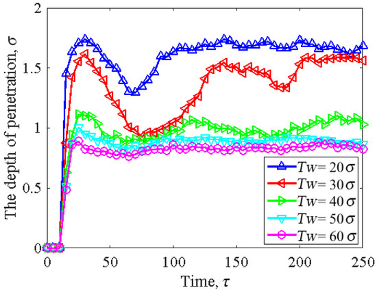 Figure 11 shows the penetration depth as a function of cylindrical asperity width. Without changing the depth of the slider asperity, when the width of the cylindrical asperity was , the contact depth of the head–disk was at its maximum, and the penetration depth of the slider exceeded . When the width of the cylindrical asperity was , the contact depth of the head–disk instantly increased and then gradually tended to be constant, and the trends of the three were roughly the same. We can conclude that, with an increase in cylindrical asperity width, the penetration depth decreases. This was because the contact area between the slider and disk increased as the cylindrical asperity width increased, which caused the penetration depth to decrease. Furthermore, we noticed that, as the cylindrical asperity width increased, especially when it exceeded , the penetration depth became more stable.