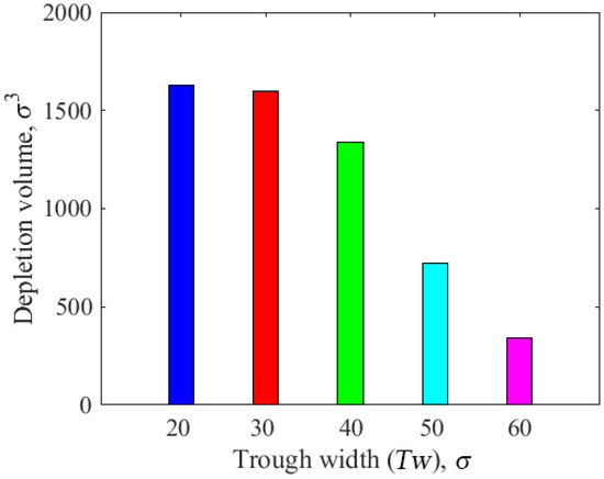 Figure 12 displays the correlation between the cylindrical asperity width and the lubricant depletion volume. When the width of the cylindrical asperity was , the lubricant consumption resulting from the contact between the head and disk was the largest, with the depletion volume of the lubricant exceeding . When the width of the cylindrical asperity was , the lubricant consumption decreased with the increase in the asperity width; in particular, when the asperity width was , the lubricant consumption resulting from the contact between the head and disk was the lowest, and the lubricant depletion volume was less than . In brief, there was a continual decrease in the lubricant depletion volume as the cylindrical asperity width increased. This further explains the influence of the slider’s structural parameters on friction loss; in particular, when the asperity width increased to , lubricant loss significantly decreased. Therefore, the depletion volume of the lubricant greatly decreases if the slider has a cylindrical asperity with a small depth and large width, resulting in a smooth step.