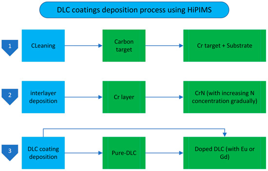 A base pressure of 3.0 × 10−5 Pa was achieved before the production of all coatings. Improving the adherence of the diamond-like carbon coatings to the substrates involved applying two interlayers before the final diamond-like carbon coating. The process initiated with an interlayer of chromium (Cr), proceeded by an interlayer of chromium nitride (CrN).