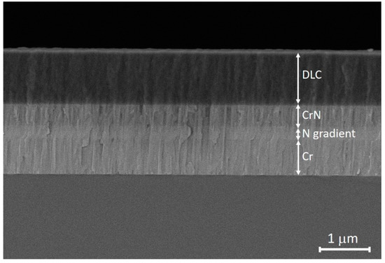 Showcases the cross-sectional profile delineating the pure DLC sample, delineating the presence of Cr and CrN interlayers along with the gradient of nitrogen distribution between these layers.