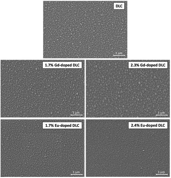 The SEM surface morphology of pure-DLC, Gd-, and Eu-DLC.