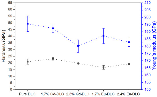 The evaluations of Young’s modulus (Y) and hardness (H), as illustrated in Figure 6, indicate that both the 1.7% Gd-doped diamond-like carbon coating and the pure diamond-like carbon coating demonstrate enhanced hardness in comparison to the other coatings, considering the margin of error represented by the error bars. Similarly, in terms of Young’s modulus, both 1.7% Gd-doped DLC and pure DLC display the highest values for this property, considering the variability indicated by the error bars. DLC coatings are primarily composed of two types of carbon bonds, resembling the hybridizations found in both graphite (addressed as sp2 hybridization) and diamond (addressed as sp3 hybridization). This unique combination contributes to the exceptional H and Y observed in DLC. However, it is important to note that diamond-like carbon films are also characterized by relatively high stresses [61,62]. In the literature, some characteristics are linked to the prevalence of sp3 hybridization within the films. Research indicates that as the proportion and density of sp3 hybridization increase, so do the levels of hardness. Enhanced hardness of surfaces leads to increased resistance against abrasive wear [9,16,38,63,64,65]. If 1.7% Gd-doped DLC and 2.3% Gd-doped DLC are compared, note that the hardness values and elasticity modulus decrease as the percentage of the dopant element increases [2].