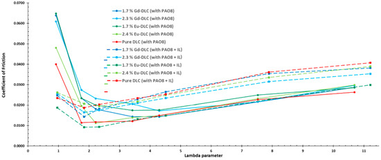 The present investigation concentrated on assessing the influence of incorporating 1 wt. % of the additive 1-Ethyl-3-methylimidazolium diethylphosphate ionic liquid into the PAO8 lubricant. This was conducted in lubricated pairs involving AISI 3415 steel coated with five distinct DLC coatings (specifically, 1.7% Gd-doped DLC, 2.3% Gd-doped DLC, 1.7% Eu-doped DLC, 2.4% Eu-doped DLC, and pure DLC films). The following key observations can be inferred from this study: