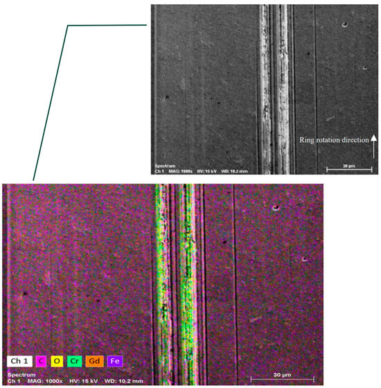 SEM and EDS were employed to assess the impact of using ionic liquid additives on coatings. However, this technique proves inadequate for effectively identifying the development of a tribofilm in this context. Its limitations lie in its inability to provide insights into chemical bonding; it solely provides elemental information. Consequently, employing more advanced methods for detecting chemical structures (for instance, ToF-SIMS or NR analysis) would be preferable for disclosing the development of the tribofilm. Within this section, exclusively, the outcomes for doped DLCs with lower atomic concentrations of dopant elements are provided (Figure 8, Figure 9, Figure 10 and Figure 11). In the situation of the 1.7% Gd-doped DLC coating combined with polyalphaolefin 8 + 1 wt. % additive, there are areas where the DLC layer has been removed, revealing the presence of chromium which comes from the interlayer. Additionally, traces of oxygen are found on the worn tracks, indicating the development of oxide layers on the worn surface. Iron is not detected in the worn tracks which indicates that the interlayer has not been completely removed (because iron is only present in the substrate). In the scenario involving the 1.7% Eu-doped DLC coating along with polyalphaolefin 8 + 1 wt. % additive, certain areas exhibit a lack of the diamond-like carbon coating, exposing chromium from the interlayer. Furthermore, hints of oxygen are identified on the worn pathways, suggesting the development of oxides on the worn sections. The fact that iron is not detectable in the worn tracks implies that the interlayer has not been completely eliminated [2].