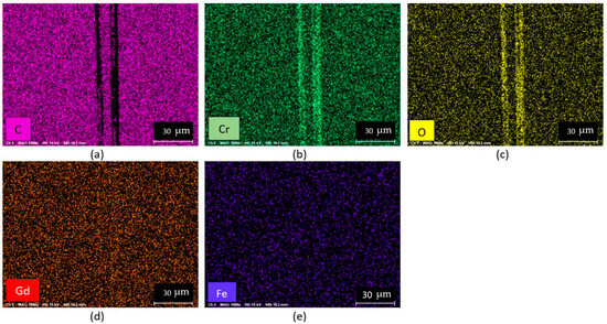 Element mapping of the 1.7% Gd-doped DLC coating combined with polyalphaolefin 8 + 1 wt. % additive following the tribology test: (a) carbon; (b) chromium; (c) oxygen; (d) gadolinium; (e) iron (analyzed using EDS technique).