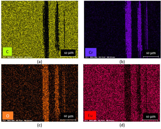 Element mapping of the 1.7% Eu-doped DLC coating combined with polyalphaolefin 8 + 1 wt. % additive following the tribology experiment: (a) carbon; (b) chromium; (c) oxygen; (d) europium (analyzed using EDS equipment).