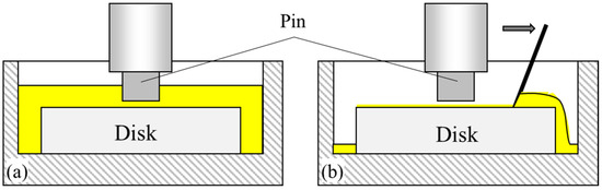 The sliding was firstly run at a low load (10 N) and frequency (1 Hz) for 10 s to ensure proper alignment of the pin and disk. Following this, the sliding was momentarily halted. Subsequently, a 50 N load was applied to the surfaces. When the load reached a steady state, the oscillation frequency was increased stepwise from 0.05 Hz to 0.8 Hz, with each frequency step lasting for 300 s. Each full-frequency ramp was repeated 5 times, and only the last 3 ramps were calculated to relieve the running-in effect. As the sliding speed is not a constant, friction force at the turning-back point would reach a peak and then reverse to the opposite peak. In this study, the average coefficient of friction (COF) was calculated ignoring the highest 10% and lowest 10% of the absolute value to minimize the random error at the turning-back point. Each test was repeated 3 times. The tests utilized commercially available L-G68 oil (SW D68, Castrol, UK) with a kinematic viscosity of approximately 68 mm2/s at 40 °C and 160 mm2/s at 24 °C. Two oil supply conditions (Figure 2) were used: immerged lubrication and limited lubrication. For immerged lubrication, the contact surfaces were immerged in the oil pool, while limited lubrication means the oil on the lower surface was scratched away using a knife edge, representing the engineering situation where the oil is brushed away by the contact edges.