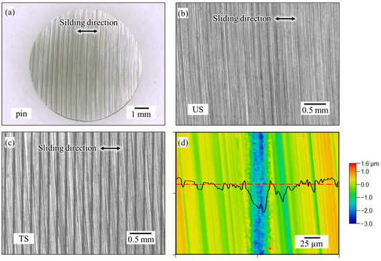 The surfaces were successfully prepared according to the design parameters listed in Table 1. Figure 3 presents the optical micrographs of the pin and disks with untextured (US) and textured (TS) surfaces. The 3D profiles for different disk surfaces are shown in Figure 4. The grinding traces were well maintained, and the bulges or burrs at the channel edge were insignificant compared to the roughness scale. Figure 5 shows the material ratio curve (MRC), i.e., the Abbott–Firestone curve, of different surfaces. Obviously, the upper parts of the curves show high consistency, while the lower parts vary significantly depending on the surface texture parameters.