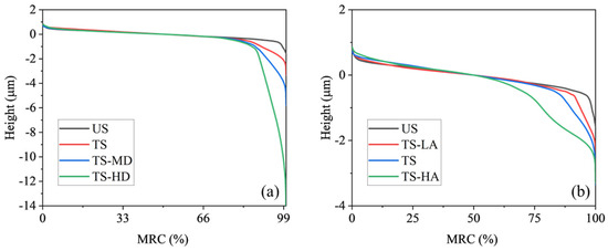 Material ratio curve of surfaces with different (a) texture depth and (b) texture area density.
