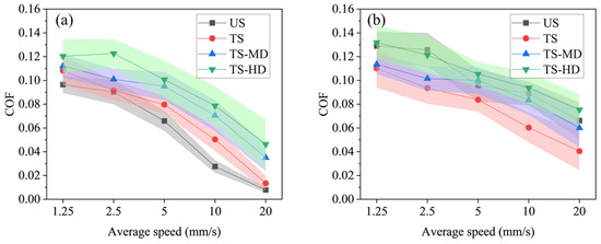 Due to the absence of lubricant oil, friction forces under limited lubrication (Figure 7b) increased for all surfaces compared to under immerged lubrication. However, the magnitude of the increment varied across different surfaces. A lower increment was observed for the TS surface, resulting in a friction reduction of up to 39% at 20 mm/s compared to the US surface. The TS-HD surface still had the highest friction, but its friction coefficient was very close to that of the US surface.