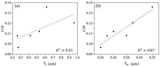 The surface topography plays an important role in tribology. Roughness parameters, as quantitate characterizations of surface topography, are expected to reflect the tribological performance and help understanding of the mechanism of contact, friction and wear, especially under boundary lubrication where the hydrodynamic effect can be ignored. Knowledge about the correlation between roughness parameters and friction is important for surface design and manufacturing control. Figure 9 shows the relation between the friction coefficient and surface roughness parameters and under immerged lubrication at an average sliding speed of 1.25 mm/s. Compared to the widely used parameter , the newly induced parameter shows better potential in reflecting friction behavior. A quasi-linear relation between the friction coefficient and was observed under such test conditions. As shown in Figure 7 and Figure 8, the friction at this speed falls into a boundary or near-boundary mixed lubrication regime. The hydrodynamic effect is comparatively low, so the friction is dominated by the shear of asperity contact. As analyzed in our previous study [21], the peak root-mean-square roughness characterizes the height distribution of the upper part of a textured surface, which is directly related to the deformation in asperity contact, so it is more correlated to friction. However, due to the limitations of tests, this still needs to be confirmed by a future study.