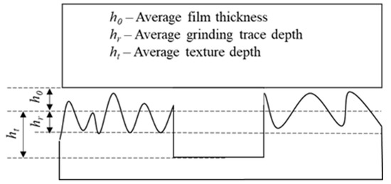 The other component is the decrease in hydrodynamic lift. The introduction of textures may undermine the hydrodynamic effect of the previous surface, leading to a friction increase. The main factor responsible for this should be the existence of plateau grinding traces. As shown in Figure 4, the plateau grinding traces were well kept and were arranged perpendicular to the sliding direction. The grinding traces, if regarded as a certain kind of texture, will cause a similar beneficial effect as texture grooves, and the laser textures may undermine the effect. The assumption is reasonable because numerical investigations [5,32] show that the highest hydrodynamic effect can be achieved when the texture depth is close to the average film thickness. The contact between two rough surfaces can be transformed into contact between an equivalent rough surface and a smooth, rigid surface [33]. As shown in Figure 10, under boundary or mixed lubrication, where two surfaces come into contact, the average film thickness is determined by the peak height of the grinding traces, while the grinding trace depth is always of the same size. The texture depth , however, can be much larger than , which will generate lower hydrodynamic lift compared to the texture traces. Thus, the higher the texture depth or area density, the lower the hydrodynamic lift, resulting in higher friction force.