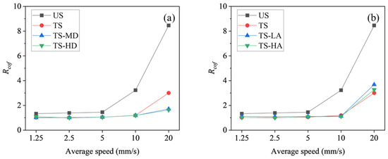 The textured area density ranged from 7.5% to 30% for TS-LA, TS and TS-HA. All the textured surfaces with varying texture area density exhibited higher friction compared to the untextured US surface under immerged lubrication (Figure 8a). The TS-HA surface had the highest friction of an up to 169% increment compared to the US surface at 20 mm/s. Under limited lubrication (Figure 8b), both TS-LA and TS surfaces showed, at all speeds, friction reduction compared to the US surface, while the TS surface exhibited better behavior in the low-speed region. The maximum friction reduction was still 39% at 20 mm/s for the TS surface.