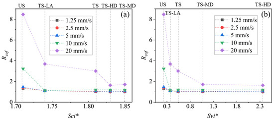 The oil retention capacity can be described by the reformed core fluid retention index and the reformed valley fluid retention index , as shown in Figure 6. As the valley area is defined as the lowest 20% of the surface, it was not feasible for the 30% textured TS-HA surface. Figure 12 shows the comparison ratio of friction coefficient for different surfaces plotted against the fluid retention indices and , respectively. The comparison ratio decreased with the increase in oil retention capacity at the core and valley area, which means greater oil storage will be beneficial for maintaining the frictional behavior when oil is drying out. However, as the oil retention capacity increased, it became less effective. As shown in Figure 12b, the almost remained the same when increased from 1.02 for TS-MD to 2.31 for TS-HD.