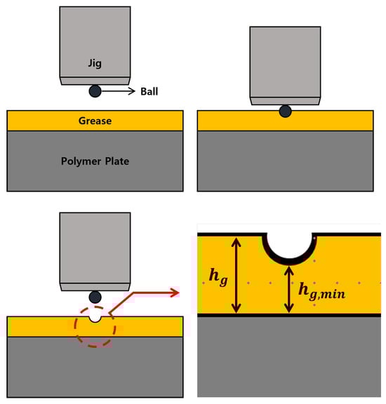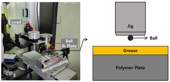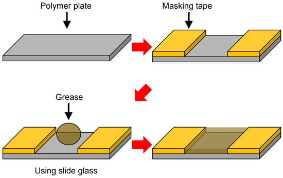 The lubricant used in the study is a fluorine-based grease. The grease employed is classified into the NLGI 1 consistency class. The grease was applied as shown in Figure 1. Masking tape with a thickness of 30 μm was attached to both ends of the polymer plate. A sliding glass was used to ensure that the masking tape adhered well to the polymer plate. Then, the grease for the experiment was placed between the masking tapes and uniformly spread using the sliding glass. Once the grease application was complete, the masking tape was removed for use in the experiment.
