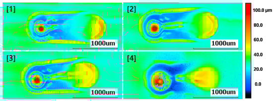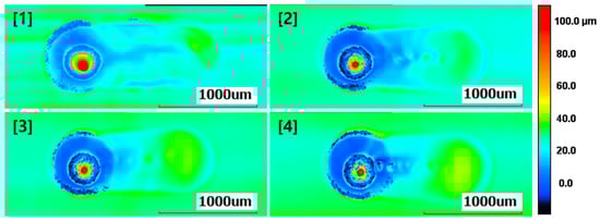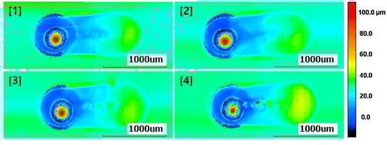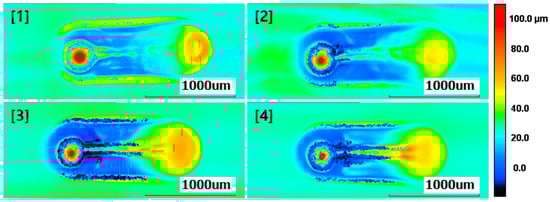 Additionally, the thickness of the grease was measured at the central contact area of the ball after friction, as depicted in Figure 4. Measurements were also taken for the thickness of the grease at non-central contact areas. As evident in Figure 5, Figure 6, Figure 7 and Figure 8, it can be observed that, upon completing the friction tests and removing the ball from the start point, the grease exhibited a high profile due to sticking to the ball. Therefore, the analysis and measurements of experimental results do not consider the shape at the start point. The experiments were conducted in an environment with a room temperature of approximately 22 °C and a relative humidity below 30%.