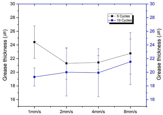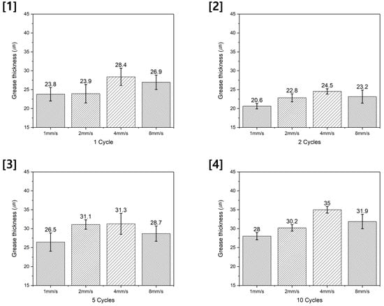 Figure 10 presents the results of measuring the grease thickness in the non-central contact area after 5 cycles and 10 cycles. In five cycles, the largest grease thickness in the non-central contact area was observed at 1 mm/s. However, as the cycles were repeated, in 10 cycles, 1 mm/s exhibited the smallest grease thickness in the non-central contact area. For other speed conditions, a similar trend was observed in 5 cycles and 10 cycles.