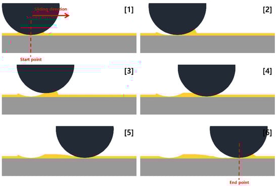 Schematic of the initial cycle. [1] Upon initial ball contact, [2] displacement of grease due to sliding, [3] changes in effective viscosity, [4–6] repetition of 1, 2, and 3.