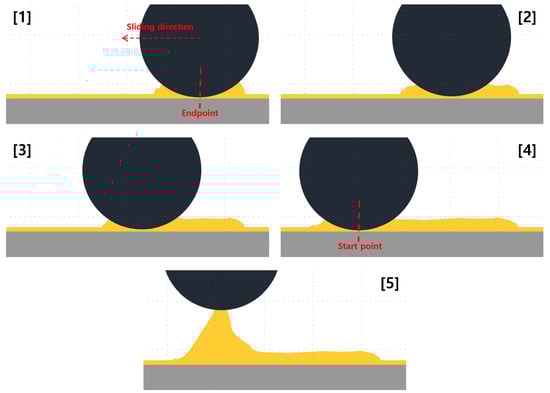 Schematic of the final cycle. [1] Displaced by the ball and initiated motion at the endpoint with the accompanying distribution of displaced grease. [2–4] Some of the greases stick to the back of the ball and flow back into the track. [5] Removal of the ball after the motion ends.