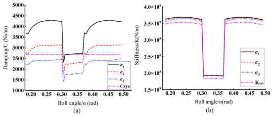 Damping (a) and stiffness (b) of different rough surfaces: σ1 = 0.35644 μm, σ2 = 0.63991 μm, and σ3 = 0.92883 μm. Csys and Ksys: damping and stiffness without considering roughness and lubrication.