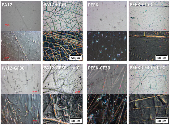 Section 3.1, it should be noted that despite the comparatively high load, complete coating failure occurred in only one case (ta-C on PA12). In most other cases of coated plastic substrates, the coatings exhibited grooves, scratches, and cracks in addition to abrasive wear, but remained largely intact. The ta-C:N coatings left the best impression, especially on PEEK and PEEK-CF30. After the tribotest, these coatings were still largely intact and showed a relatively smooth surface in the wear track. The behavior of the ta-C:N coating on the PEEK substrates was still worse than on steel, but it came closest to steel in the appearance of the wear behavior.