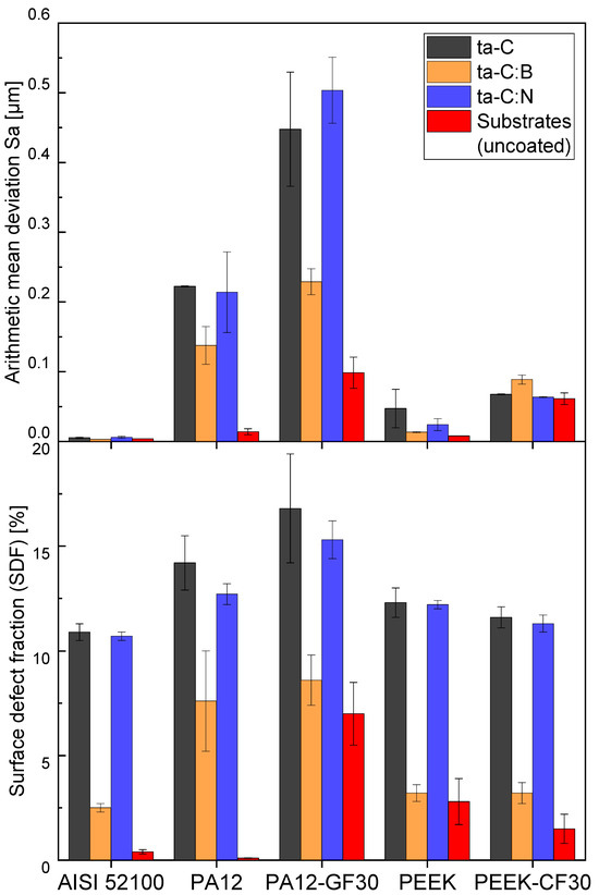 Figure 2 (bottom)) showed strong variations for the different coatings, but the nature of the changes depending on the coating type was the same for all substrate variants. This shows that the SDF parameter reacts very sensitively to coating-specific surface defects, with the ta-C:B film having the lowest SDF in all coated cases. The SDFs of ta-C and ta-C:N were very similar because the coating plasma is identical except for the N