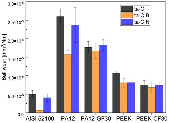 Table 2), the wear behavior of coatings on different substrates and the wear of uncoated steel-ball counter bodies were analyzed. In these tests, the three coating types, ta-C, ta-C:N, and ta-C:B including the 0.1 µm Cr interlayer (see