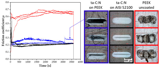 Overall, it can be stated that the ta-C:N coating greatly improved the load-bearing capacity of the PEEK. The tribological behavior of the system is very similar to that of the ta-C:N-coated steel substrate, even if—as mentioned above—the service life is limited under these harsh conditions.