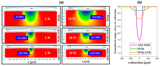 As expected, the results show large differences in the contact surfaces, the level of compressive stress generated in the substrate by the ball indentation, and the different spatial distributions of the stress in the substrate. In this way, it becomes clear why the track widths of the coatings on the plastics in the wear tests are always wider than on the coated AISI 52100 steel (≈500 µm vs. ≈150 µm). It is now also clear why the counter-body wear values (ball abrasion) with the same coatings were significantly higher with the plastics than with steel (see