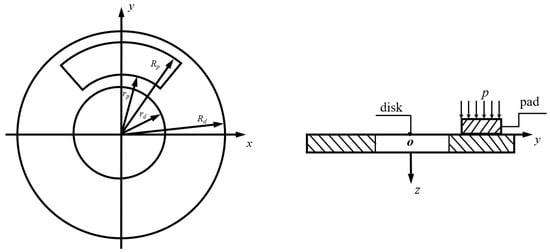 Due to the axial symmetry of the brake disc structure, the brake disc can be simplified into a two-dimensional axisymmetric brake disc model, as shown in Figure 2. The brake disc system is composed of a brake disc and a brake pad. During braking, mechanical energy is converted into heat energy in the immediate area of the friction path between the brake disc and brake pad. The generated heat is dissipated by the axle, brake disc, and the exposed surface of the brake disc by heat conduction, heat convection, and heat radiation. During the whole braking process, the following assumptions are made: