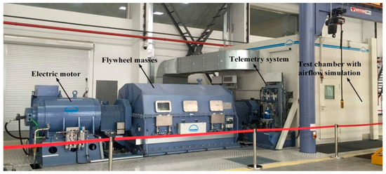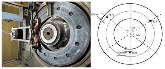 The test data were obtained on a Renk’s full-scale dynamometer test bench, which is shown in Figure 5. The test sample consists of a wheeled brake disc and brake calliper, which are placed in the test chamber to simulate the train operation environment. The temperature is measured by six thermocouples embedded 1 mm from the brake disc surface. The location of the test points is shown in Figure 6. This method can only obtain six continuous temperature points of the brake disc, and the average temperature of the six measuring points is taken as the temperature of the brake disc. In this test, the temperature of the brake disc for braking twice consecutively is tested, and the speed curve of the brake disc is shown in Figure 7.