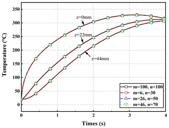 Take the temperature obtained from the grid density of 100 × 100 as the reference value to investigate the relative error of the temperature obtained from the other three grid densities. The relative error is expressed as , where is the temperature at point (z0, r0). Table 2 shows the calculation time and relative errors of the four grid densities.