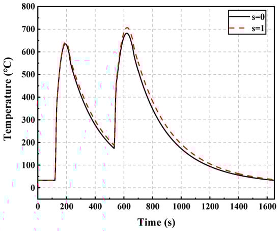 The treatment of boundary conditions has a great influence on the temperature of the brake disc. In Equation (3), when s = 0, the influence of thermal radiation is considered, and when s = 1, the influence of thermal radiation is ignored. This part discusses the effect of the thermal radiation in the boundary conditions on the temperature field of the brake disc. The disc parameters and speed curve used in the numerical model are consistent with those used in the experiment.