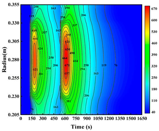 It can be seen from Figure 13, at the moment of the highest temperature, that the temperature of the radial section of the brake disc gradually decreases from the highest temperature at z = 0 mm to the inside of the brake disc. Since the thickness of the brake disc is much less than the radial thickness of the brake disc, the temperature of the brake disc increases rapidly in the thickness direction, and the temperature at z = 18 mm is higher than that at r = 355 mm. Moreover, in the thickness direction, the friction surface of the brake disc is affected by the friction heat flow, and the heat energy diffuses in the direction of z = 18 mm.