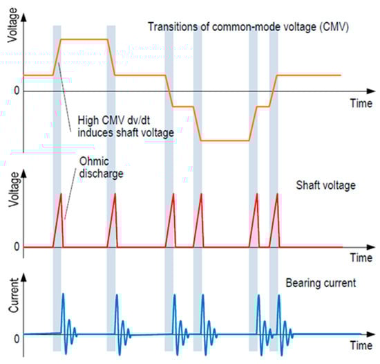 Due to the presence of the large AC motor, rotating components are exposed to shaft voltages and the large electric field inherent with such a high voltage. Shaft voltage generation is not a new concept; frictional-based electrostatics and manufacturing-based magnetic field asymmetry are both historical phenomena that cause motor shaft voltage generation [15,16,17]. A relatively new effect is caused by the high switching frequencies of the inverter. Faster switching inverters provide advantages to system efficiency by mimicking a more exact sine wave. However, the speed at which the voltage changes causes local voltage spikes on the shaft [18,19]. Figure 2 shows the details of this process.