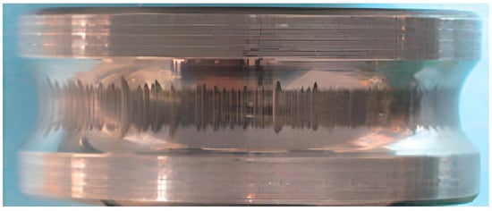 While grounding through the load side is theoretically possible, a more common grounding path involves flow through the electric motor’s deep-groove ball bearings, which support the rotor within the motor housing. Due to their proximity to the origin point of the stray currents, the motor bearings are widely considered the rotating component most at risk from current flow through them. The potential across the bearing builds until the voltage becomes strong enough to break down the dielectric strength of the thin film of the lubricant separating the ball from the bearing race. Once this breakdown occurs, the rapid transfer of current across the bearing can result in surface damage, as shown in Figure 4. This damage is called fluting [21,22,23].