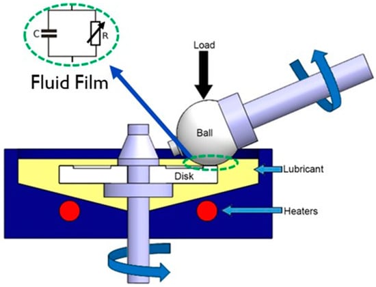 The SRR represents the degree to which the ball rolls and/or slides against the disc. This is achieved by independently controlling the speed of the ball and disc. A 100% SRR represents the ball and disc traveling at the same speed, while an SRR of 0% represents pure rolling (disc stationary), and an SRR of 200% represents pure sliding (ball stationary) with the SRR defined as in Equation (1), where u1 is the disc speed and u2 is the ball speed at the contact between the disc and the ball. Controlling the SRR will allow for the simulation of rolling and sliding contacts, such as gears or roller elements. As shown in Figure 5, the lubricant forms a film between the ball and disc. Electrically, the film will have some impedance, which is dictated by the film thickness and electrical resistivity of the fluid.