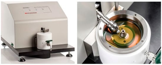 Images of the MTM test rig (left) and disc and ball test specimens in a lubricant bath with the cover removed (right) (courtesy PCS Instruments).