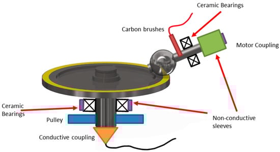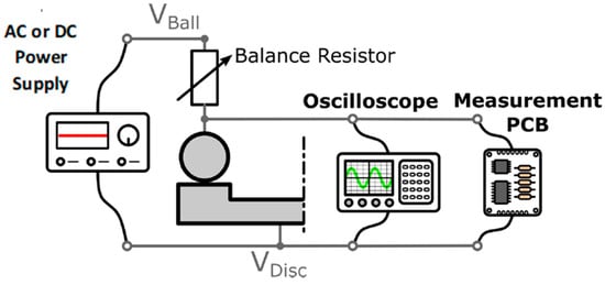 The MTM was isolated from the test components by replacing the standard steel bearings with ceramic bearings. Non-conductive sleeves were also added between the drive shafts and the motor couplings. To apply a potential across the ball, the shaft was fitted with a carbon brush and slip ring. The disc is driven by a pulley system—the motor drive is connected to the disc drive via a rubber belt. The lower portion of the disc drive shaft was fitted with conductive coupling to allow an electrical connection. The resulting electrical circuit used in the PCS Instruments MTM-EC is shown in Figure 8 and is internal to the MTM-EC test rig.