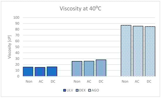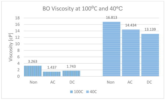BO viscosity at 100 °C and 40 °C under non-electrified AC and DC conditions.