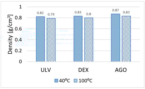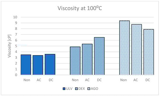 Figure 14 shows the density of each lubricant. Measurements were taken using an Anton Paar SVM 3001 per ASTM D7042. There is currently no means of measuring density under electrified conditions; therefore, all the results are for non-electrified conditions. The difference in density between the ULV and DEX lubricants both at 40 °C and 100 °C is negligible, being 1.2–1.3%. The AGO lubricant density increases just under 5% than that of the ULV and DEX lubricants at both 40 °C and 100 °C.