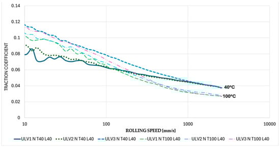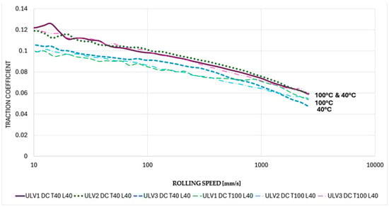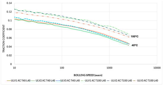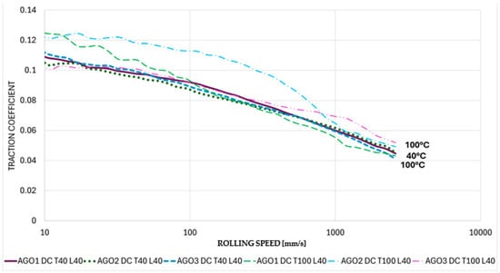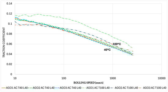 The AGO lubricant is a more viscous fluid than the ULV and DEX lubricants. This results in a greater film thickness between the ball and disc throughout the entire speed range of the MTM than that experienced by the ULV and DEX lubricants. Hence, the convergence of the traction coefficient at the highest speeds. This convergence repeatability disappears under AC and DC conditions, particularly at 100 °C, and can be explained by the decrease in viscosity, which is particularly noticeable at 100 °C when the AGO lubricant is subjected to AC and DC power, as shown in Figure 12 and Figure 13.