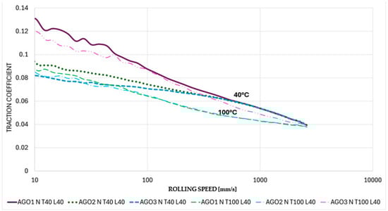Non-electrified Stribeck curves for AGO at 40 °C and 100 °C for a 40 N applied load.