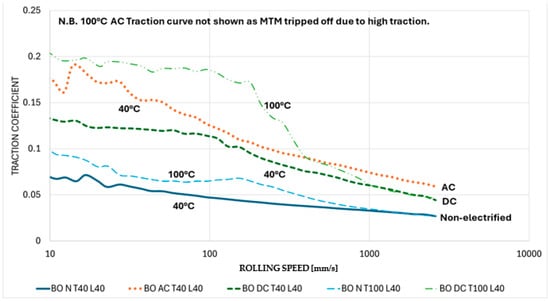 A base oil was also tested to compare the traction and repeatability of the fully formulated lubricants. Figure 24 shows the Stribeck curves for a BO with no additives at 40 °C and 100 °C under non-electrified, AC, and DC conditions. One run for each condition is shown. These results show the expected outcome, with 100 °C non-electrified having a higher traction coefficient than non-electrified 40 °C. The 100 °C result exhibits a higher traction coefficient than the 40 °C result because of the reduction in viscosity due to temperature, and hence, the reduction in film thickness. Both the 100 °C and 40 °C non-electrified Stribeck curves converge at a higher speed. When DC current is applied, both the 100 °C and 40 °C traction coefficient values are significantly higher than those when non-electrified, but again converge at higher speeds. The AC results at 40 °C have a higher traction coefficient than the DC results at 40 °C. The 100 °C AC test would not run, tripping the rig off due to the excessively high traction coefficient values. In part, this is due to a reduction in viscosity of the BO under AC and DC conditions, as shown in Figure 25, with 100 °C AC condition giving 1.4 cP. However, there has to be more occurring in the base oil than just a viscosity change; otherwise, all the 100 °C traction curves would be considerably higher than the 40 °C traction curves.