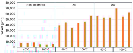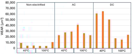 Wear volume at non-electrified, AC, and DC electrification for MERCON® ULV at 40 °C and 100 °C for a 40 N applied load.