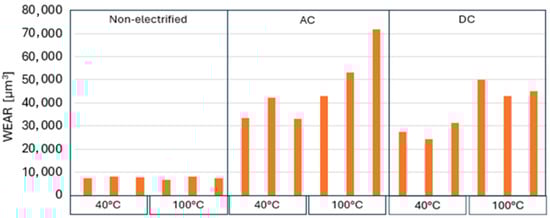 Wear volume at non-electrified, AC, and DC electrification for DEXRON® VI at 40 °C and 100 °C for a 40 N applied load.