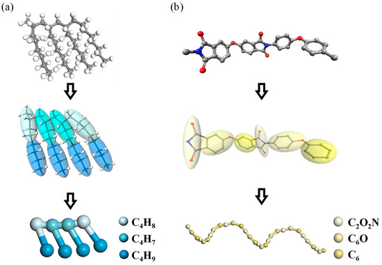 Given the enormous number of atoms present in polymer molecules, all-atom simulations, while offering insights into their microscopic intricacies, inherently limit the scale of the simulation systems. Coarse-grained (CG) simulation simplifies the representation of particles by grouping the selected atoms into beads, which can enhance the spatial and temporal scales of the simulation and improve the calculation efficiency. However, this approach can lead to a loss of microscopic details between atoms and reduce the accuracy of the potential functions. Therefore, model validation is conducted prior to the simulation to ensure that the coarse-graining method does not alter the physicochemical properties of the material. Specifically, based on the CG method suggested by Marrink [21,22], the all-atom models of PAO and PI in Figure 2 were coarse-grained using Material Studio. The coarse-graining approach for PAO involves mapping four carbon atoms and their attached hydrogen atoms into a single particle, which enables the classification of PAO molecules into three types of particles: C4H7, C4H8, and C4H9, as illustrated in Figure 3a. In this way, a PAO molecule consisting of 98 atoms can be reduced to eight particles, resulting in a 91% decrease in the number of particles. The coarse-graining approach for PI is based on the phenyl ring structure within the PI monomer, defining mapping regions that categorize PI molecules into three types of particles: C6, C6O, and C2O2N, as shown in Figure 3b. By coarse-graining the PI molecules, a single PI molecule consisting of 36 atoms can be reduced to six particles, resulting in an 83% decrease in the number of particles.